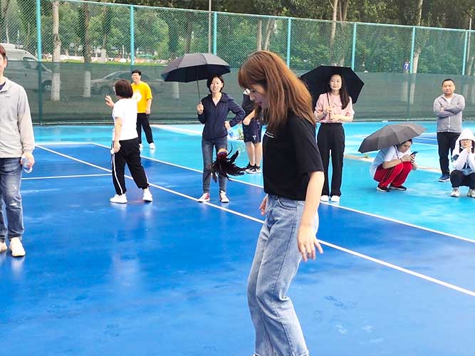 這是為女生們準(zhǔn)備的個(gè)人賽,同理,男生也可以挑戰(zhàn)。參加者每人一次機(jī)會(huì),踢毽子在不間斷、不落地的前提下,個(gè)數(shù)*多者勝利。并且冠*可以直接去選一個(gè)獎(jiǎng)品拿走。